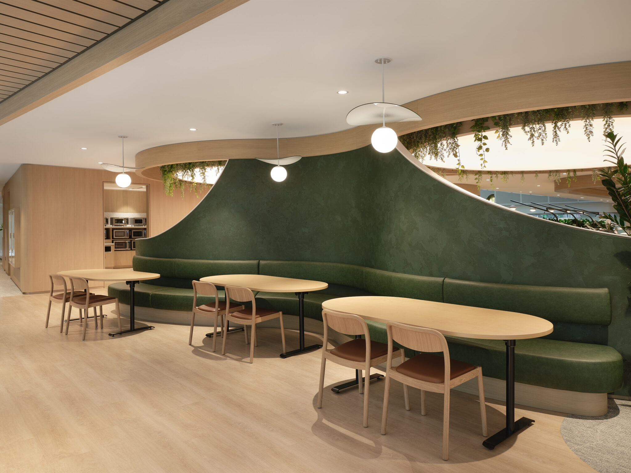 Ce lieu se veut un véritable hub de connexions, tant avec l’humain qu’avec la nature. Il propose une variété d’espaces de rencontre allant de zones ouvertes et lumineuses dotées de grandes tables conviviales, à des coins plus intimistes grâce à des banquettes courbes, des refuges et de petites tables propices à la discussion.