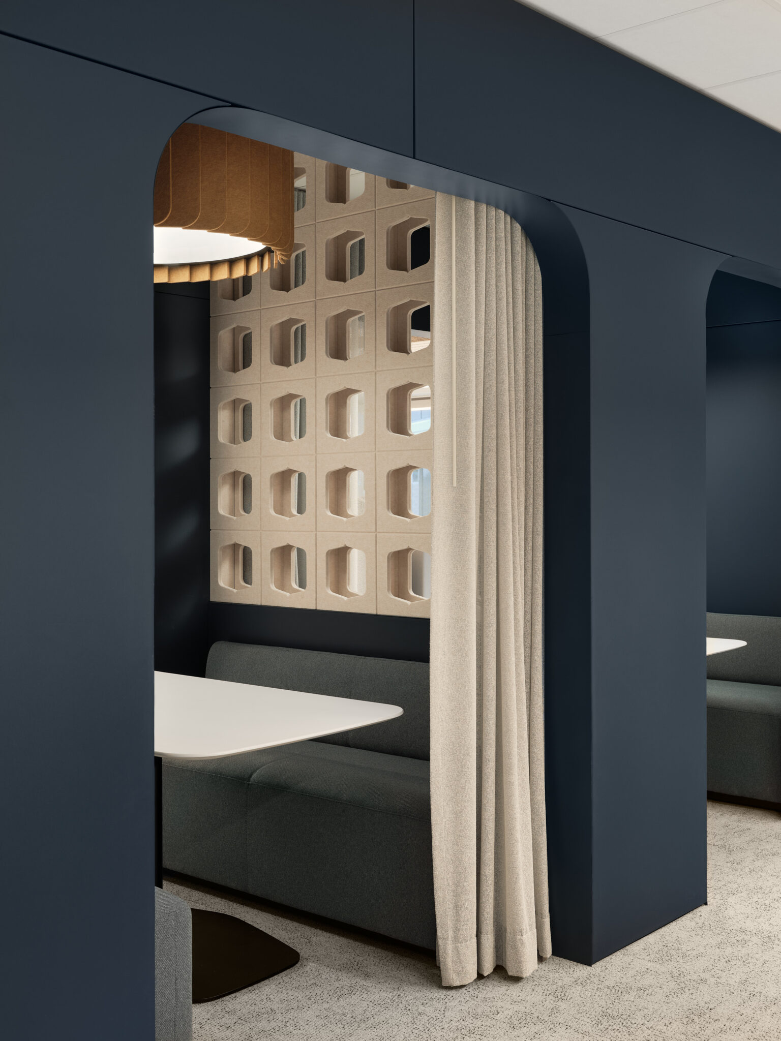 L’aménagement se structure autour d’une zonification claire, répondant aux besoins variés des usagers. Les postes de travail en aire ouverte favorisent les échanges et la collaboration, tandis que des cabines individuelles offrent des espaces de retrait propices au calme, à la concentration et à la productivité. Plusieurs salles de rencontre soutiennent le travail d’équipe au quotidien, complétées par une grande salle de conférence modulable, conçue pour s’ouvrir ou se subdiviser selon les usages. Afin d’accompagner les activités événementielles de la BDC Boucherville, un espace traiteur adjacent a également été intégré, facilitant l’accueil et la tenue d’événements dans un cadre fluide et fonctionnel.